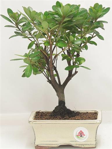 Rhododendron indicum (Ericacee) Arbusto sempreverde, originario del Giappone, con piccole foglie di un bel verde scuro. La peculiarità di questa essenza è la spettacolare fioritura primaverile, che ne fa una delle più belle piante da fiore in assoluto. L'Azalea, come tutte le Ericacee, ama essere annaffiata con acqua decalcificata; preferisce le posizioni ombreggiate (infatti il habitat ideale è il sottobosco di conifere) e si presta a tutti gli stili bonsai.