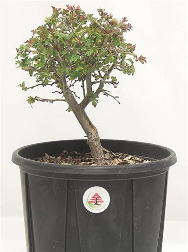 Crataegus monogyna (Rosacee). Alberello che in natura raggiunge i 10 mt. di altezza, particolarmente generoso nella produzione di fiori bianchi molto persistenti, ai quali segue lo sviluppo di bacche rosse. Si trova allo stato spontaneo in Europa, Asia, America ed Asia. Bonsai particolarmente resistente ai parassiti e alle avversità climatiche, ama posizioni soleggiate e non richiede particolari cure per la coltivazione.
