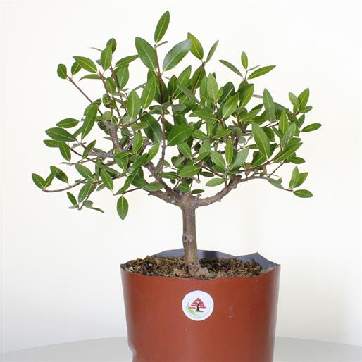 Phillyrea angustifolia (Oleacee) Alberello sempreverde, tipico della macchia mediterranea, con piccole foglie lanceolate di un bel verde scuro. In natura raggiunge i 3 mt. di altezza con un portamento arbustivo. Produce fiorellini bianco-rosati, ai quali seguono delle piccole bacche blu. Si presta molto bene alla coltivazione a bonsai ed è una essenza particolarmente resistente alla siccità.