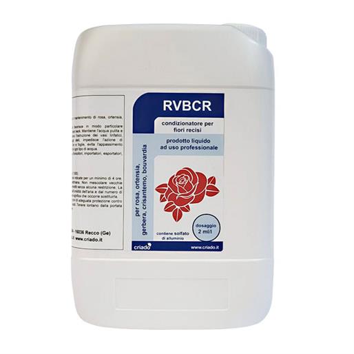 DOSI E MODALITA’ D’IMPIEGO Dosaggio: 2 ml per litro d'acqua. Mettere i fiori in soluzione di acqua e RVBCR alle dosi indicate per un minimo di 4 ore. Dosatore automatico: regolare a 0,2% (1:500) Igiene: usare secchi e vasi puliti Acidità: il prodotto è acido, non utilizzare recipienti metallici (zinco, rame, ferro) privi di adeguata protezione contro la corrosione. Usare pompe e recipienti adatti agli acidi (plastica, gomma, vetro ecc.) Acqua: preferibilmente usare acqua fornita dall'acquedotto. Se si usa acqua di sorgente o piovana dotare la pompa dosatrice di filtro. Durata della soluzione: circa 7 giorni a temperatura ambiente, 15 giorni in cella frigorifera. La durata della soluzione dipende dalla temperatura, dall'umidità dell'aria e dal numero di steli riposti in soluzione. Se la soluzione diviene scura significa che occorre sostituirla. Non mescolare vecchie soluzioni a quelle nuove. Smaltimento: nessuna restrizione. Precauzioni: evitare il contatto della soluzione concentrata con la pelle e gli occhi. Durata stoccaggio: il prodotto sigillato si conserva per 24 mesi. Stoccaggio: conservare il recipiente ben chiuso in luogo fresco e asciutto. Proteggere dal gelo.