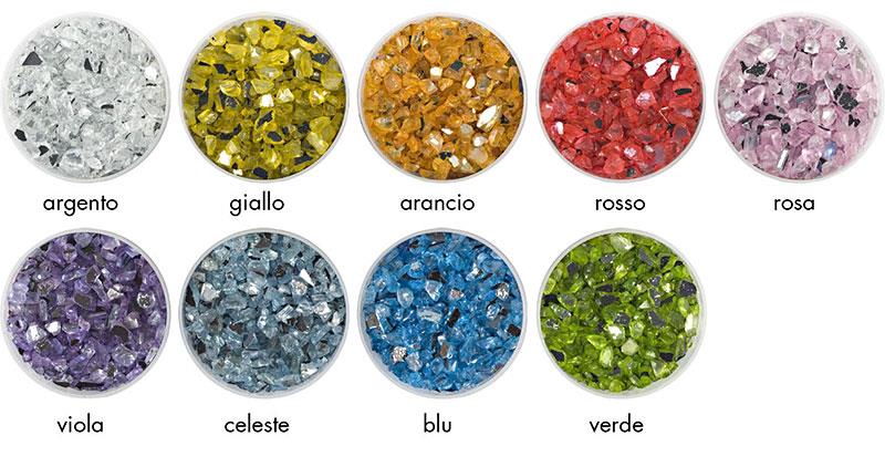 argento, giallo, arancio, rosso, rosa, viola, celeste, blu, verde.